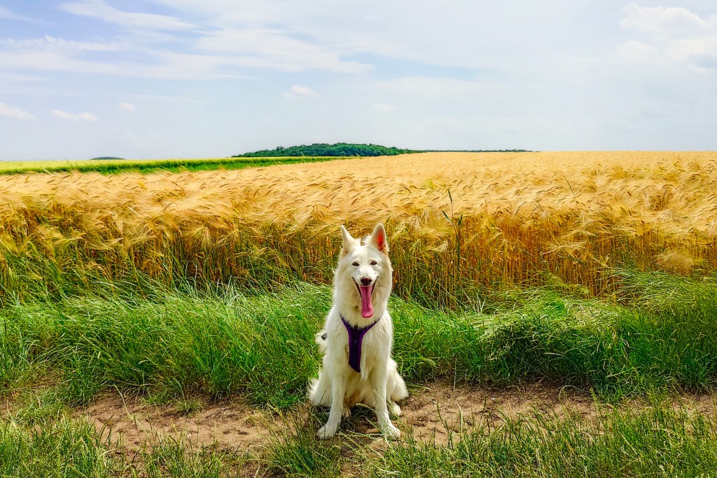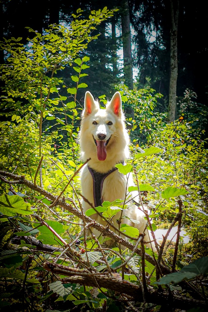 Yuna ma bergère blanche. Elle sait qu’il ne faut pas tirer en laisse alors elle ne tire pas au canicross. Un défi pour elle de tirer que lorsqu’elle est équipée !