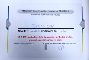 En 2025, je valide mon examen de coach en comportement canin après avoir fait plus de 50 cas cliniques avec, pour chacun, un suivi de deux mois ainsi qu’un un examen pratique avec suivi de deux mois d’un vrai client. Par la suite, j’obtiens les droits de suivre les chiens en thérapie comportementale en étant agréé par l’état de Vaud en tant que Profil 2.