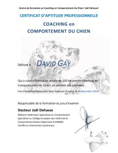 Coach en comportement canin certifié de la formation du Dr. Med Vet Joël Dehasse